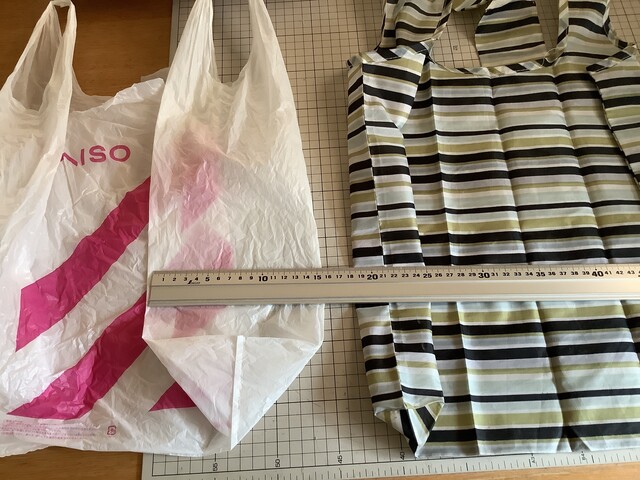 3倍は違う、手作りしたエコバッグもマチは16㎝、このレジ袋も同じぐらいありました。