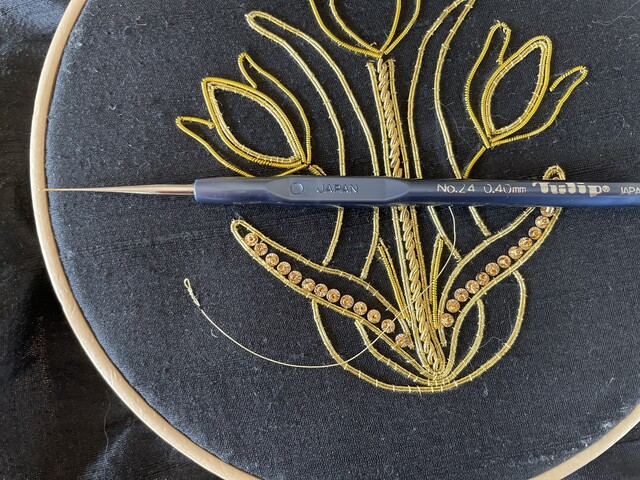 今丁度ゴールドワークをしていて、針と糸で表から刺しているので、